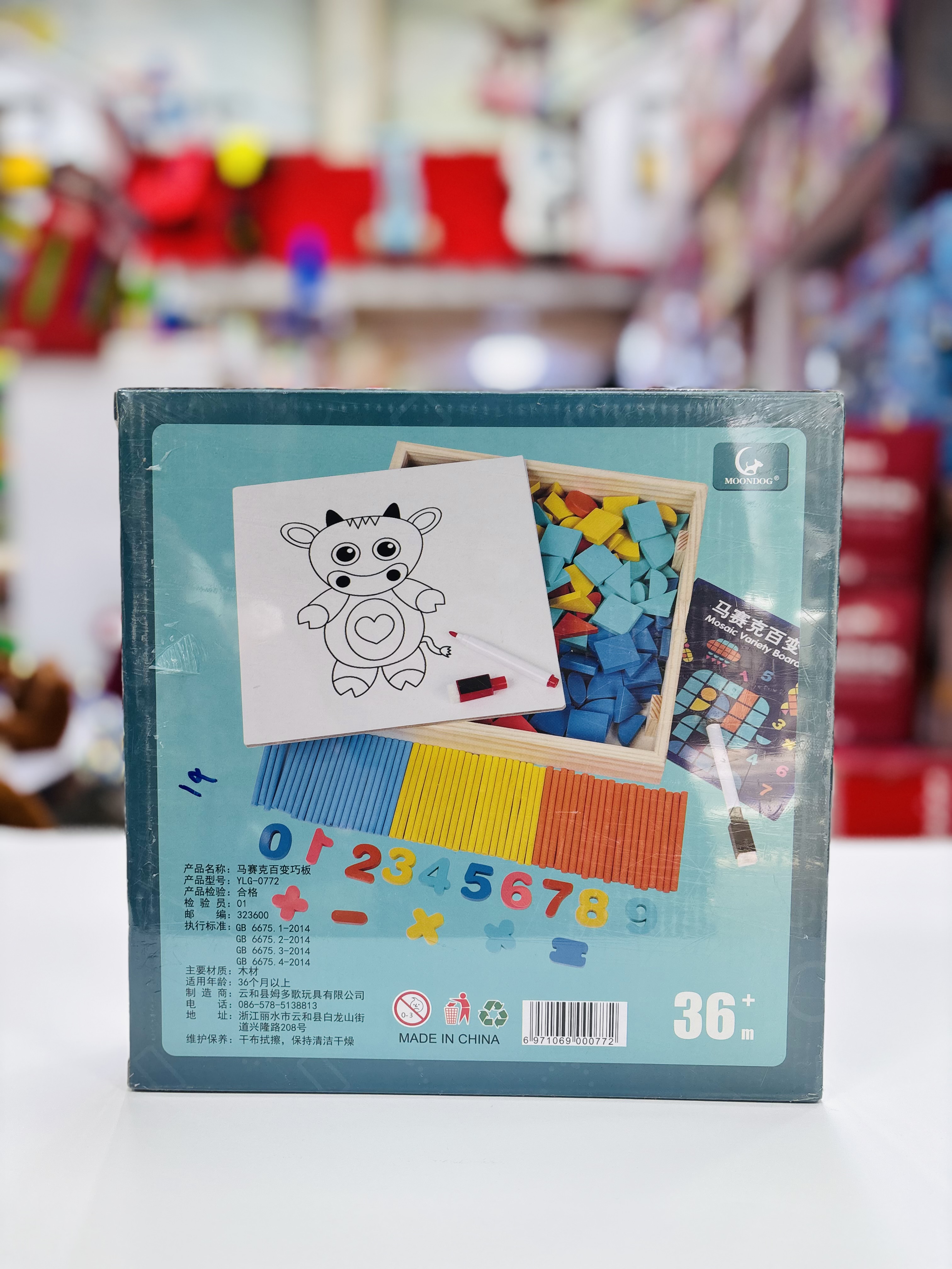 تخته بازی، قطعات تانگرام، چوبخطهای رنگی، اعداد و علائم ریاضی چوبی، کارتهای الگو