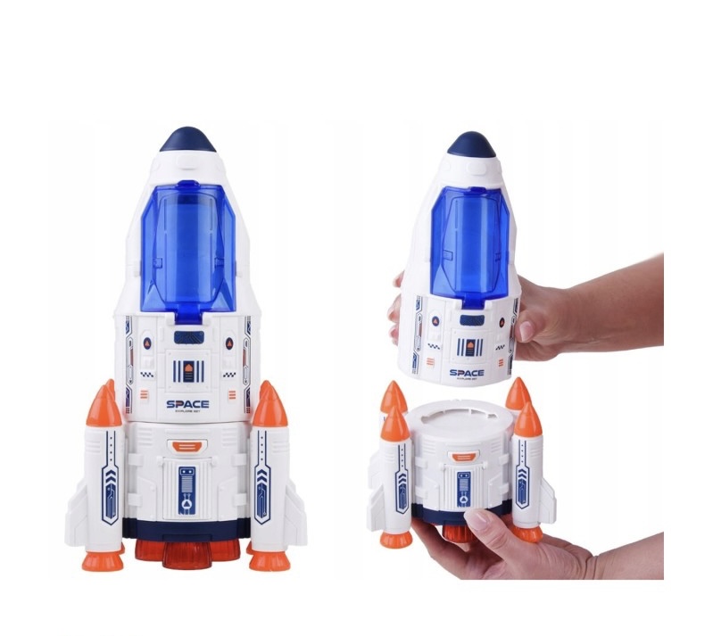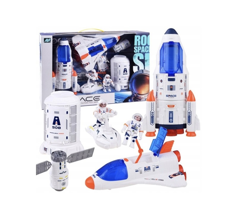 شامل حداقل ۶ قطعه اصلی: ۱. راکت بزرگ با کلاهک جداشونده ۲. شاتل فضایی یا فضاپیما ۳. ماژول یا کپسول ایستگاه فضایی (با پنل خورشیدی) ۴. ایستگاه فرود کوچک ۵. فیگور فضانورد